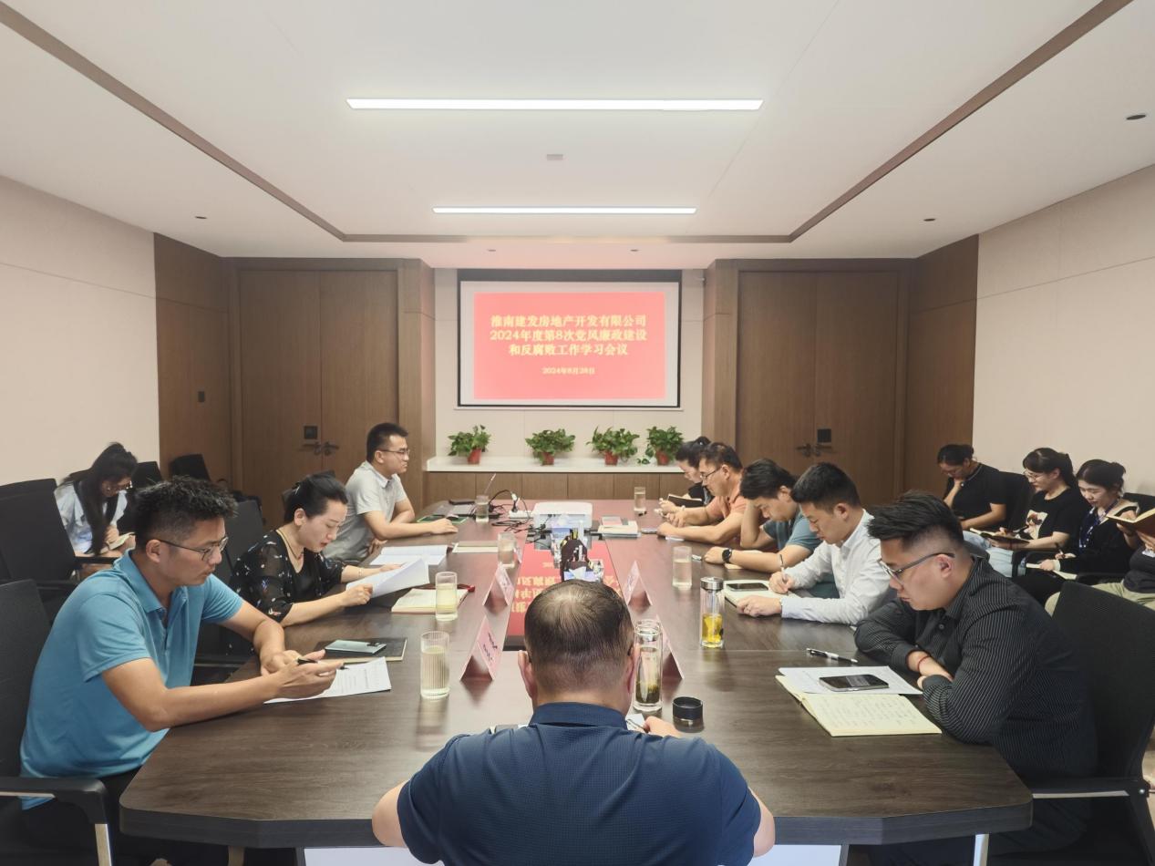 8月28日下午,淮南建发房地产开发有限公司在如意庭营销中心2楼会议室召开2024年度第8次党风廉政建设和反腐败工作学习会议,项目总经理戴建新主持,公司全体员工参加。