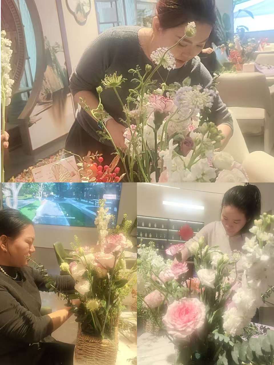 活动现场花香四溢,玫瑰、紫罗兰、洋桔梗等鲜花材料错落摆放,温馨雅致。女员工们兴致盎然,发挥创意巧思,修剪花枝、搭配花材,在交流互动中完成各具特色的插花作品,现场洋溢着欢声笑语与创作热情。